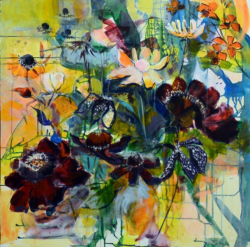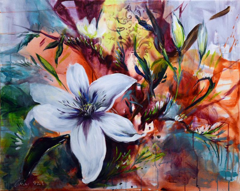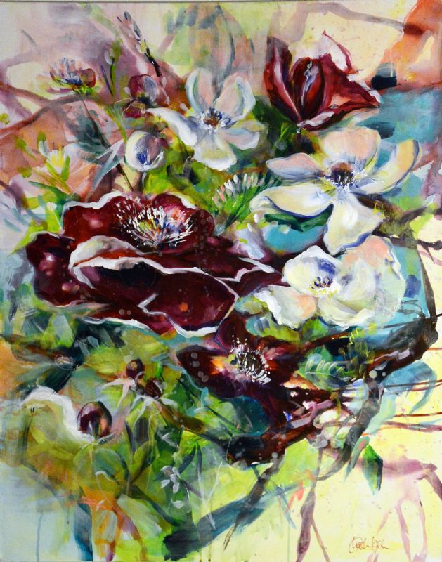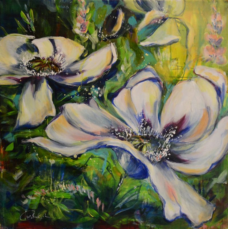 Fra de kraftfulde vidder til det sansemættede mikrounivers i haven. Blomsternes fortælling ses også ofte i Christinas malerier. Helt tæt på de enkelte blomsterhoveder, så farver og dufte gengives i ekspressive farverige strøg.