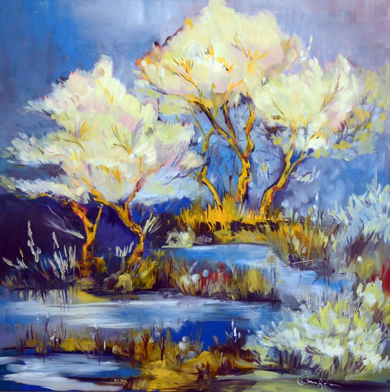 Inspirationen til maleriet samles i den vestjyske natur og dels på årlige studierejser bl.a. til Færøerne og Island. Lande hvor menneskets og dyrenes liv er underordnet naturens kræfter. Det er landskabets massive urkraft, lyset, de store vidder og den rå natur, som fascinerer hende, og som skaber grobund for de malerier der udtrykkes.