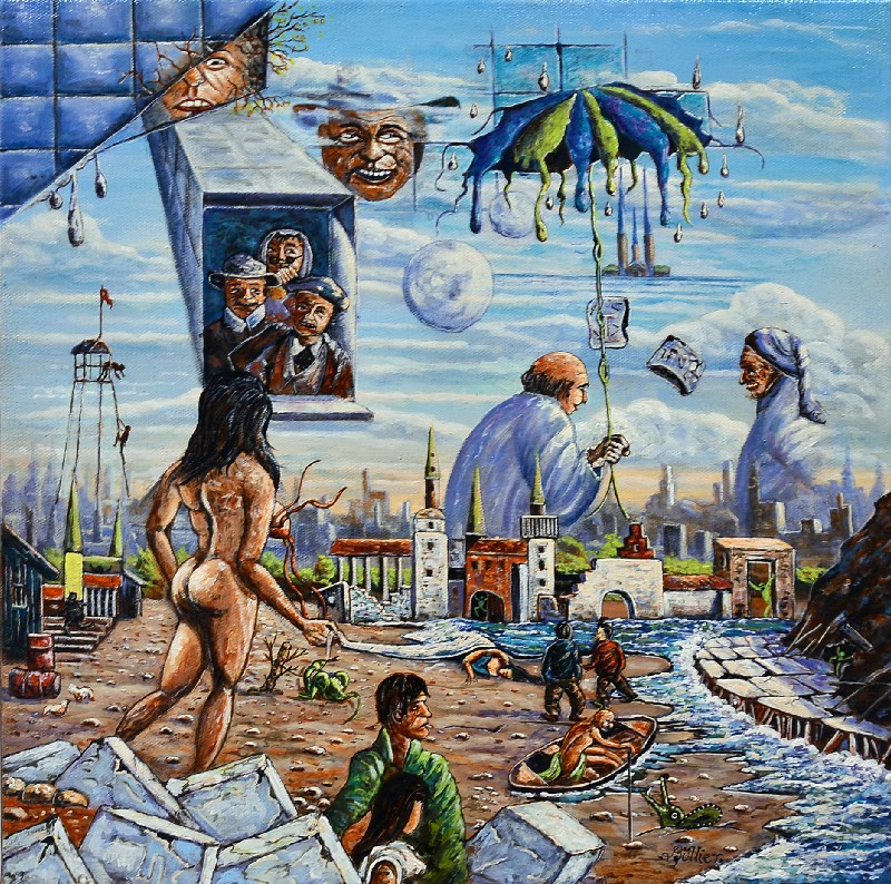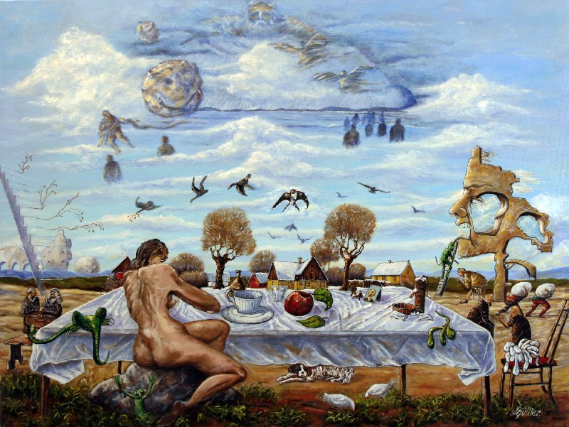 Henning Büllier ønskede ikke at ligne andre kendte surrealister, hvorfor han næsten altid tog udgangspunkt i dagligdagsting eller konkrete motiver fra mange udlandsrejser. Han anvendte en ældgammel malemetode, hvor bl.a. forskellige laktyper benyttedes, ligesom de gamle mestre gjorde. Undervejs i tilblivelsen, blev maleriet tilsat en masse finurligheder, som gør maleriet ekstra spændende, men dog ikke i en grad, så det oprindelige motiv ikke fastholdes. Spøjse ideer dukkede op undervejs i fremstillingen, blev vurderet og indarbejdet i værket. Selv ikke de mindste detaljer var for små at tage med. Nogle gange måtte kunstneren endda bruge lup og pensler med ganske få hår.