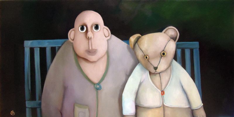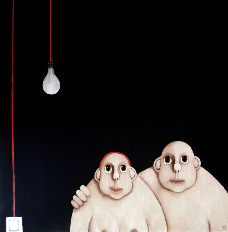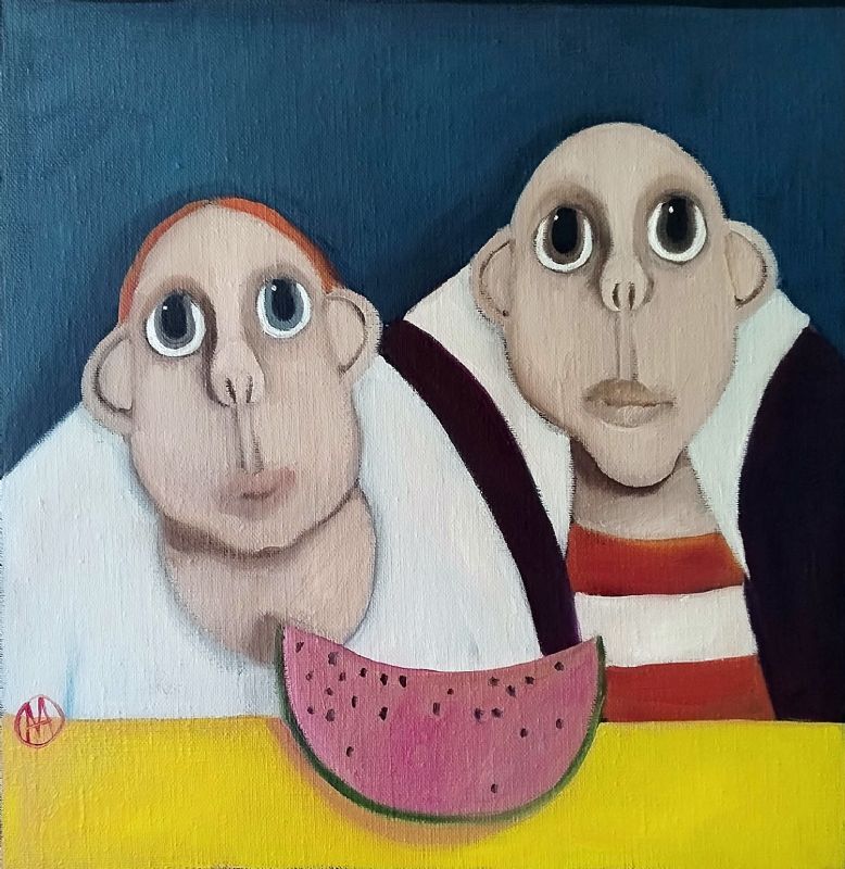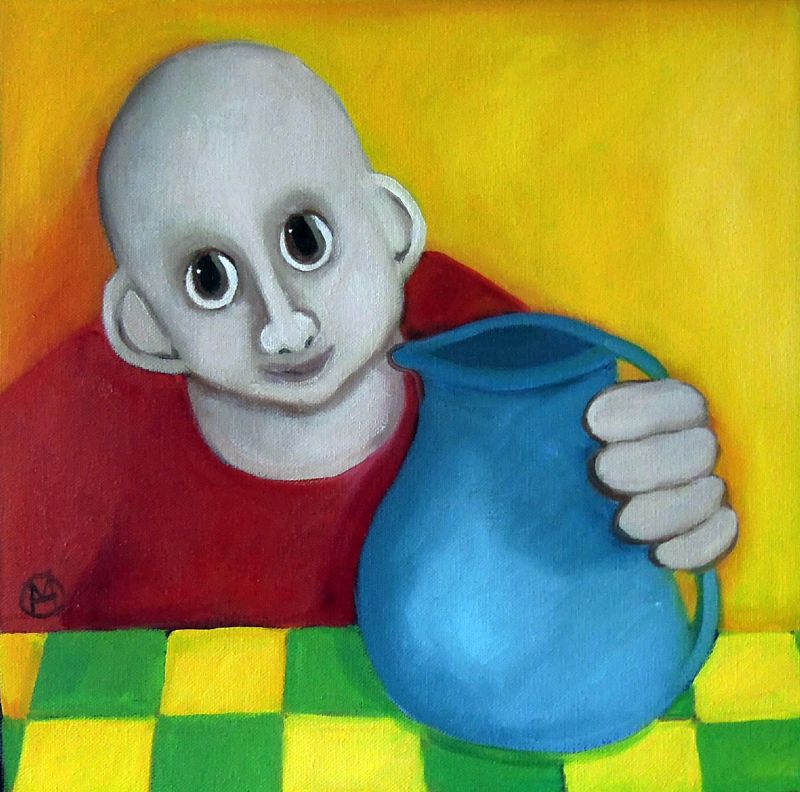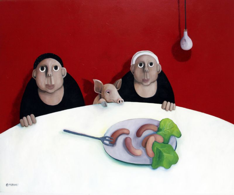 Den lille gris sidder med til bords, selvom der er pølser på fadet. Maleriet er et bidrag til debatten om dyrevelfærd. Jeg har malet flere billeder om dyrevelfærd gennem årene og mener, at vi skal behandle alle levende væsener ordentligt. Gør vi det, kan vi godt snuppe en pølse med god samvittighed. Som forbrugere bestemmer vi faktisk selv, hvad der skal produceres. Vi kan bare lade være med at købe de ”dårlige” varer.