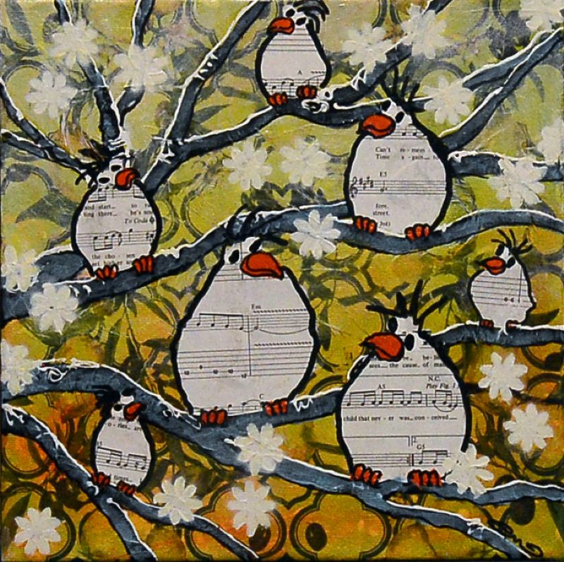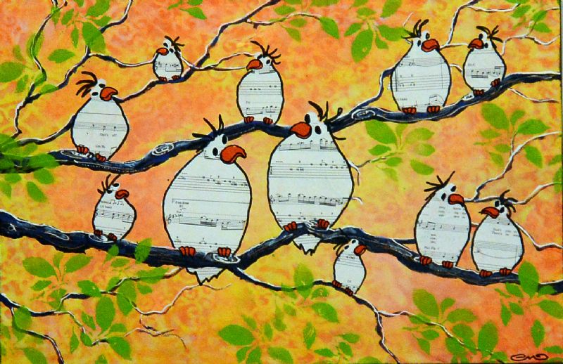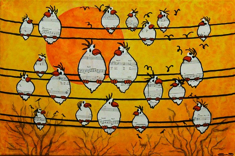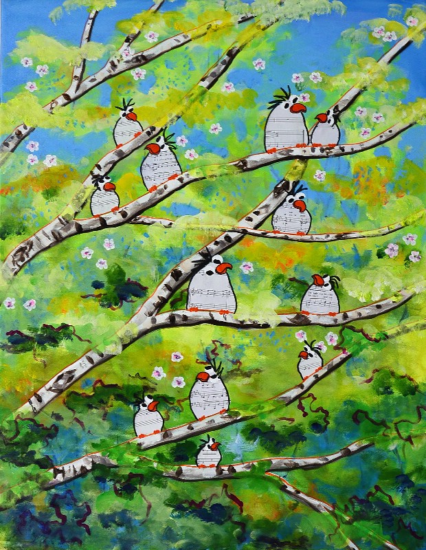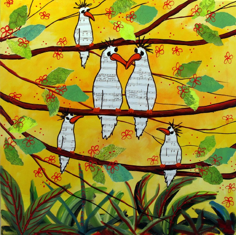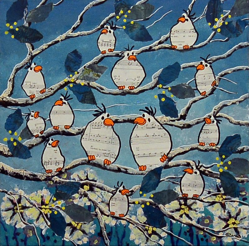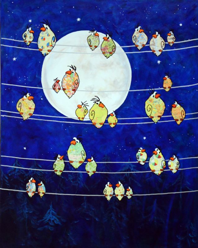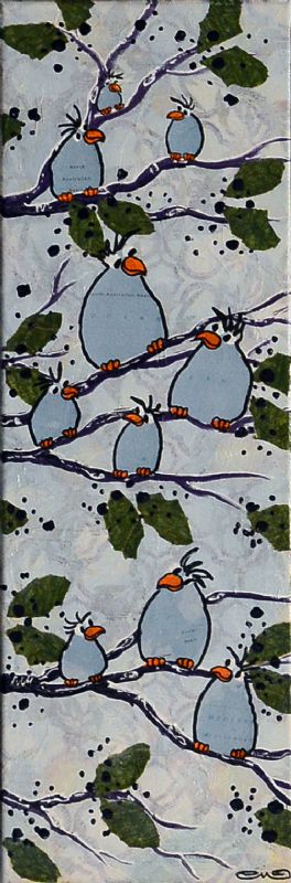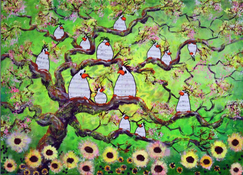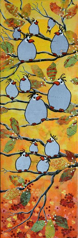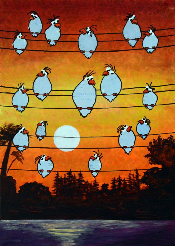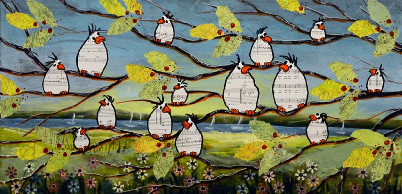 Man kan som beskuer også vælge at tro, at Lena Mandal har valgt kun at beskæftige sig med de glade fugle, der i livlig kommunikation med hinanden dyrker sammenholdet og det store tætte familiemønster. Enkelte billeder indikerer dog også det lidt dystre med de sorte troldgrene, der lukker sig omkring fuglene, der stadig er i flok, men som nu virker forundrede og måske en anelse skræmte.