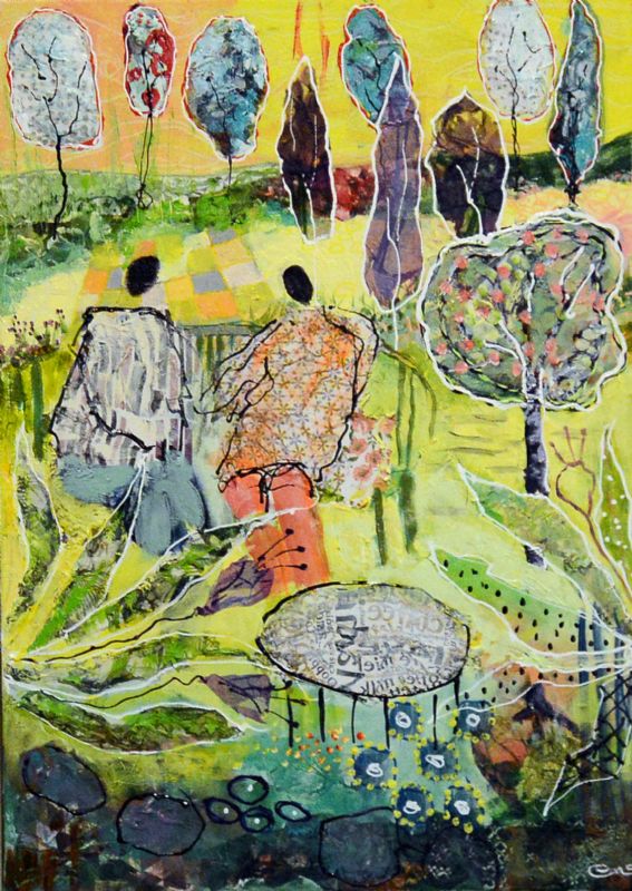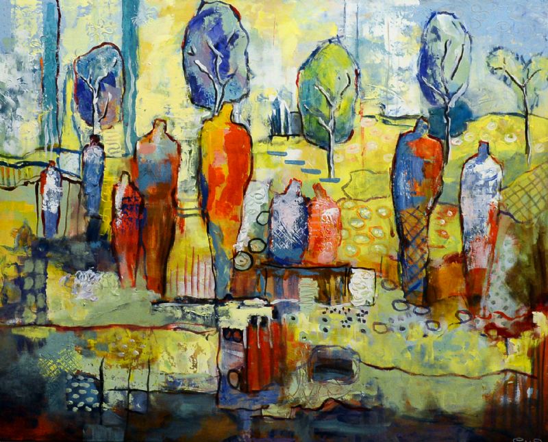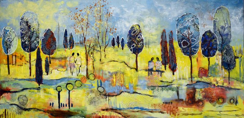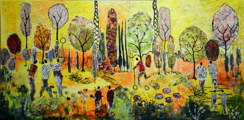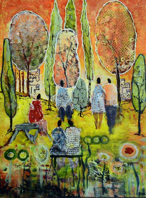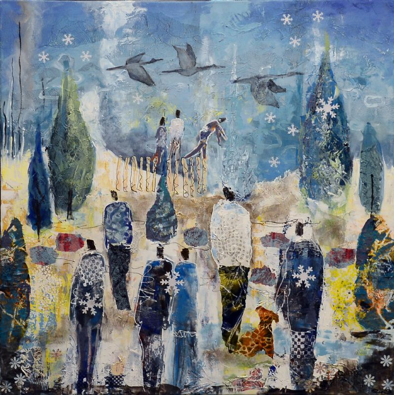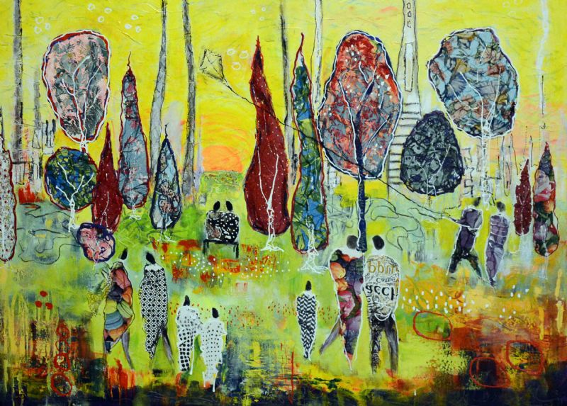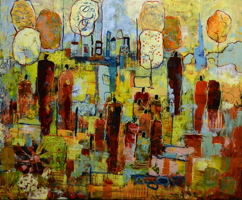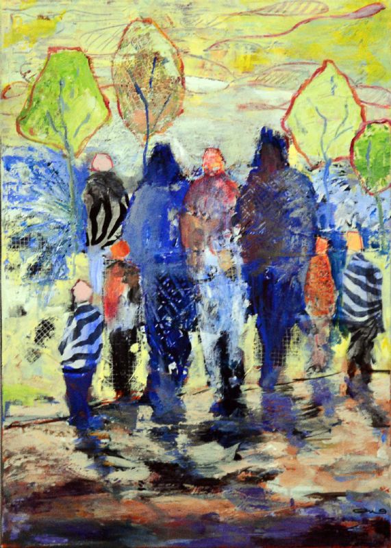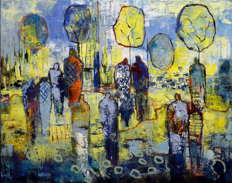 Motivserien “Mennesker og natur” opbygges med farver, livslyst og bevægelse, der viser relationer og mødet mennesker imellem. Hun viser os verden omkring os, men ligger også op til egen fortolkning af stemning og følelser.