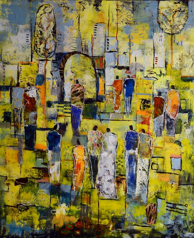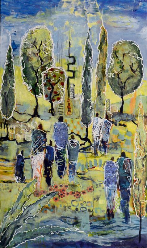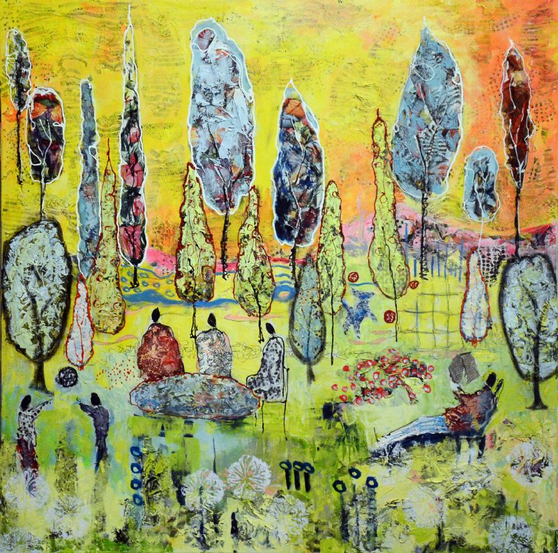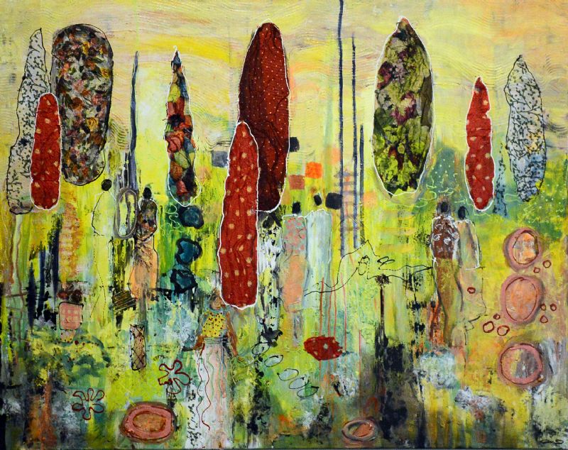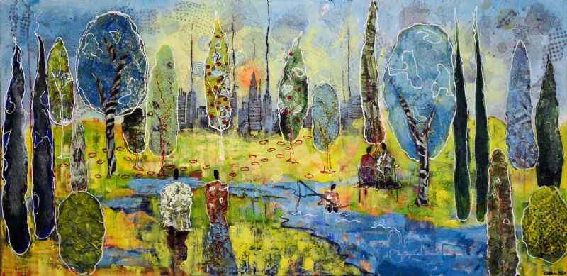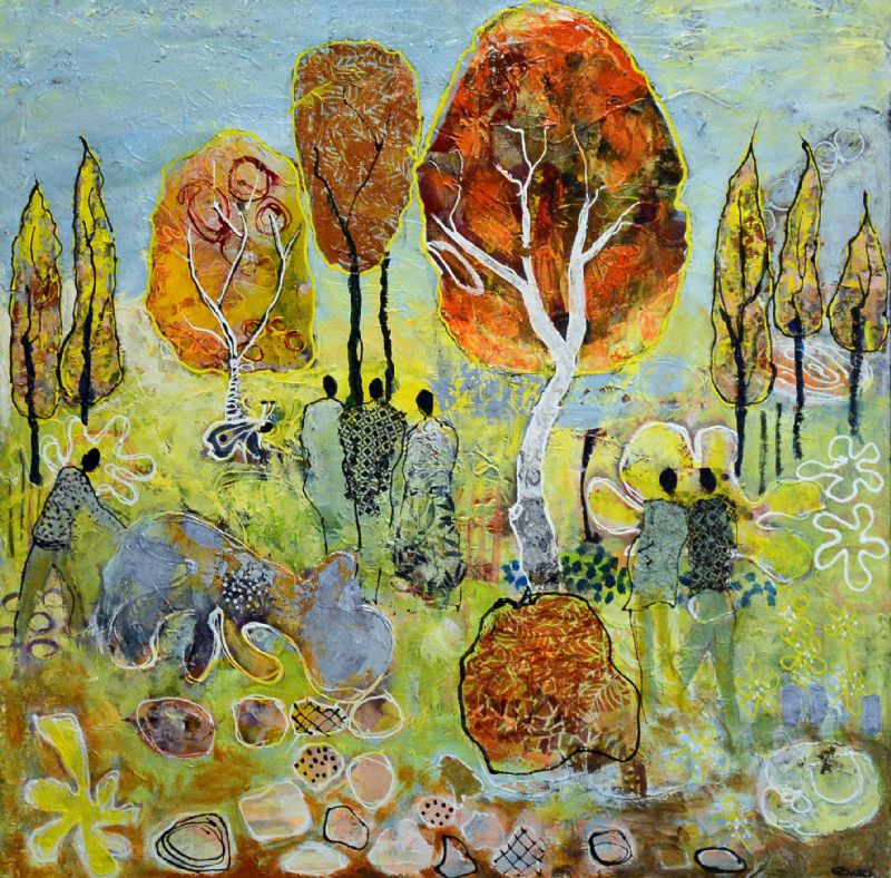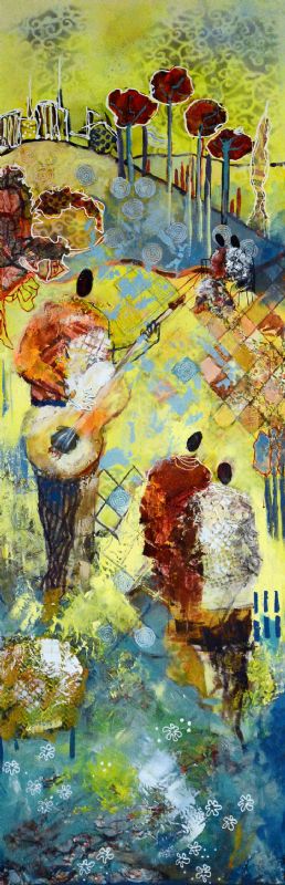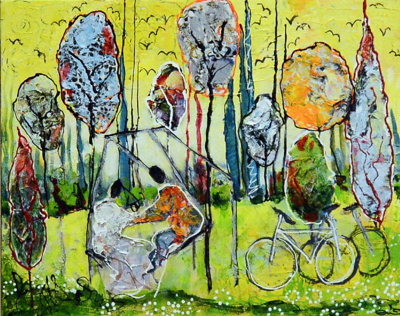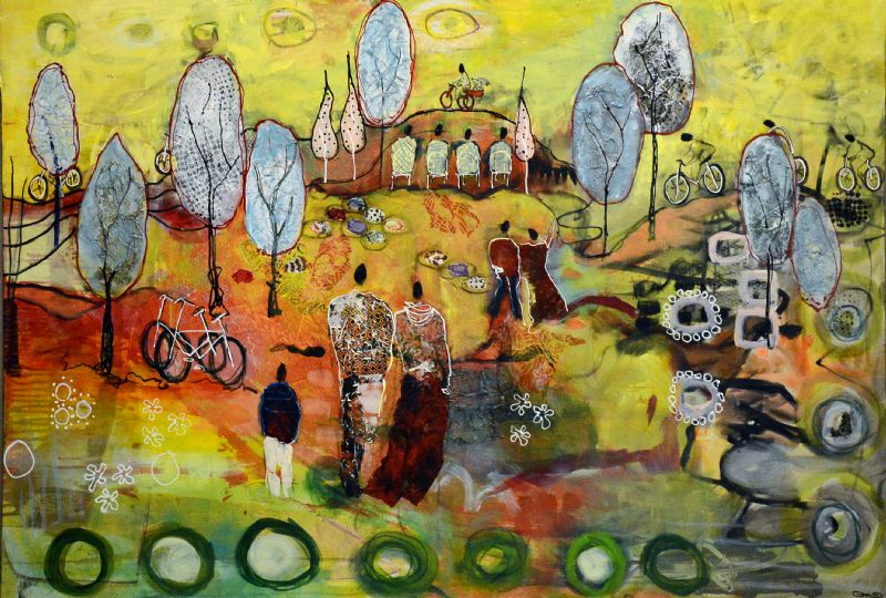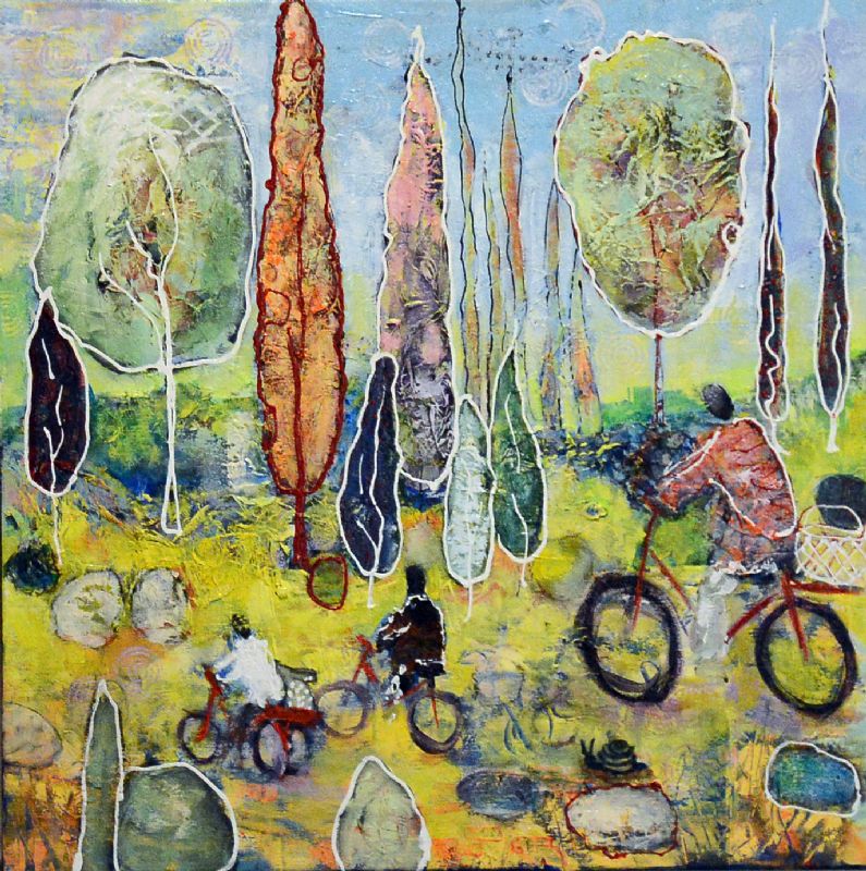 Motivserien “Mennesker og natur” opbygges med farver, livslyst og bevægelse, der viser relationer og mødet mennesker imellem. Hun viser os verden omkring os, men ligger også op til egen fortolkning af stemning og følelser.