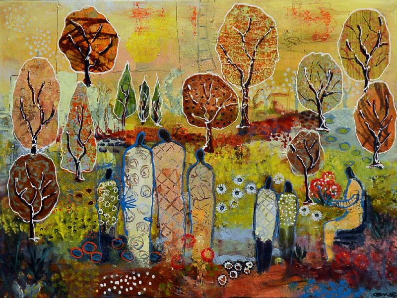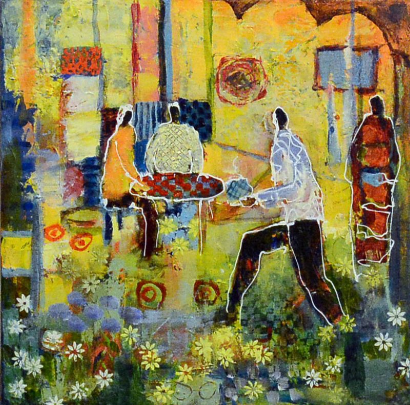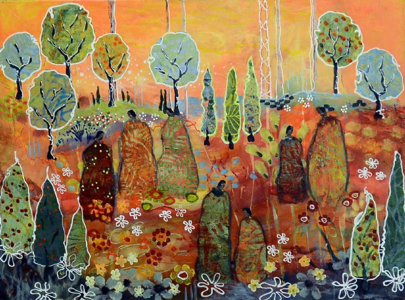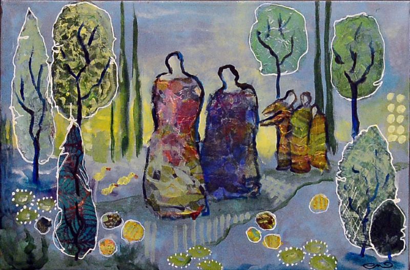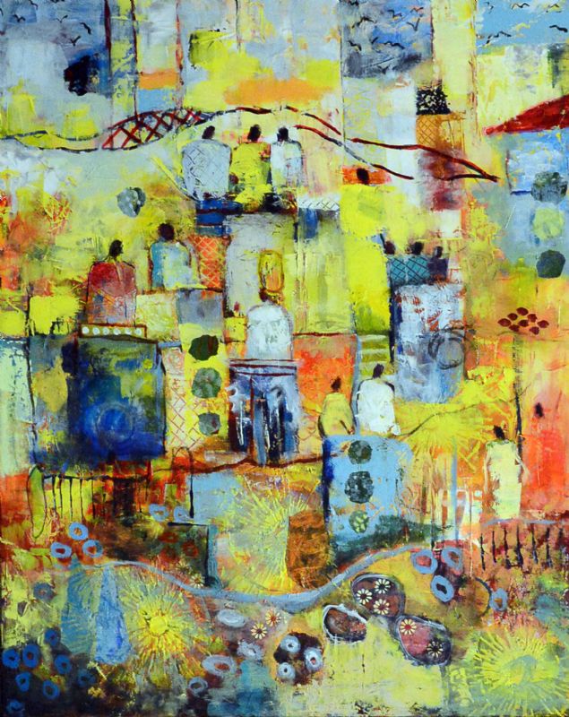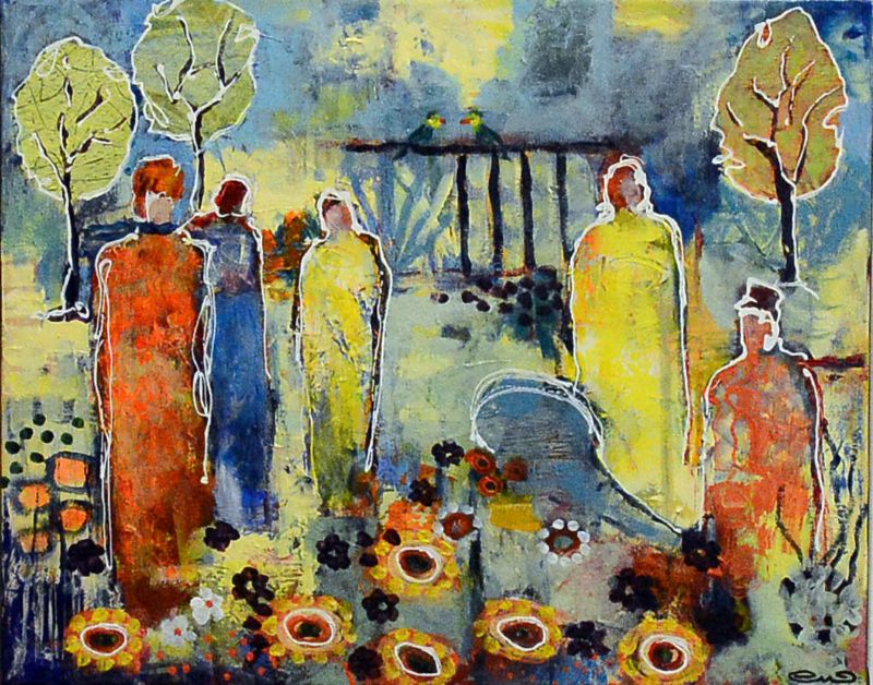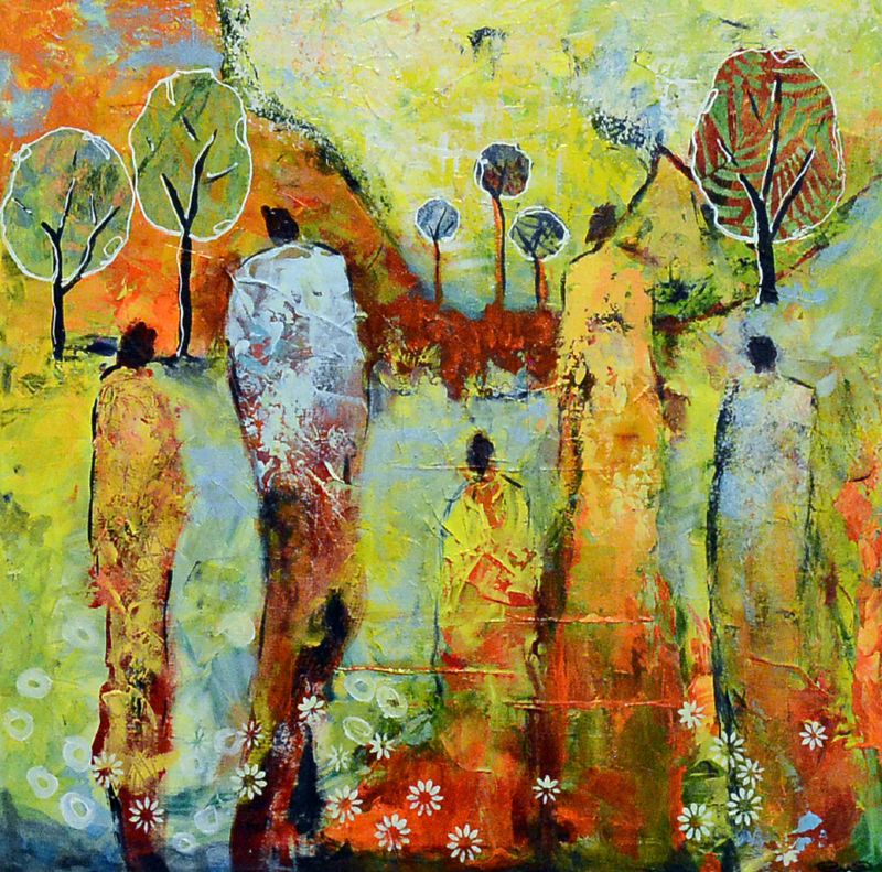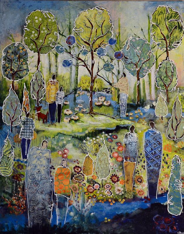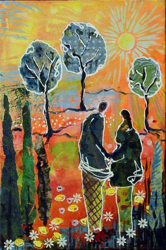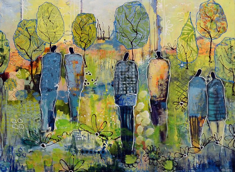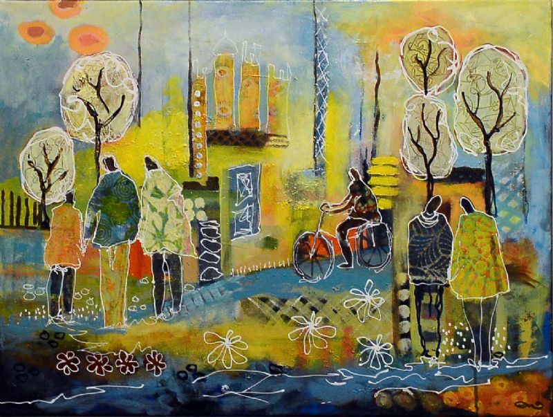 Motivserien “Mennesker og natur” opbygges med farver, livslyst og bevægelse, der viser relationer og mødet mennesker imellem. Hun viser os verden omkring os, men ligger også op til egen fortolkning af stemning og følelser.