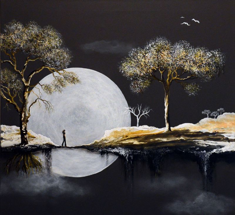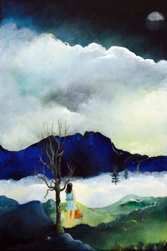 DEN MAGISKE REALISME – hvor vi tages med på en rejse til fortryllede landskaber med gigantiske træer, ofte svævende i et vægtløst univers. De små figurer under de store træer oplever den ubegrænsede frihed i nuet, og den fredfyldte drømmeverden de befinder sig i kan måske krakelere når som helst.