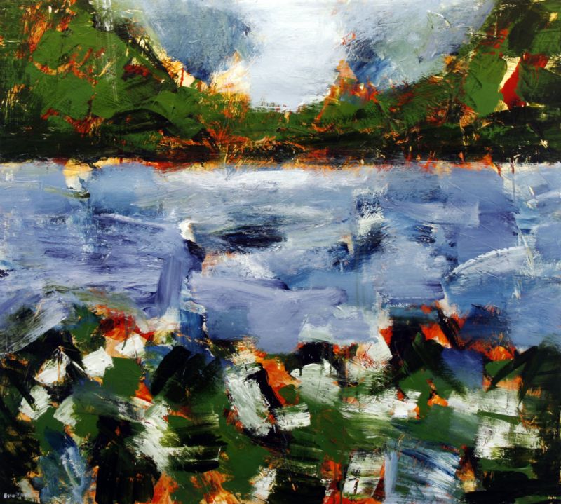 I mine værker tager jeg udgangspunkt i det færøske landskab, og i alle mine værker er det, det meget skiftende lys og vejr og farver jeg prøver at fange glimtvis og genskabe på lærredet. I de fleste af værkerne kan man skimte Fuglaførdur med Leirviksfjeldet ude i horisonten. Alle mine værker har en længere proces, og jeg er altid i gang med flere værker på samme tid. Lyset efter en storm og efter en opklaring er noget jeg oplever gang efter gang på Færøerne…et øjeblik jeg ikke kunne være foruden i min malerproces og i min inspiration…Værket er malet færdigt i foråret 2016, men fik sit første strøg sommeren 2014. Øssur Mohr, 2016